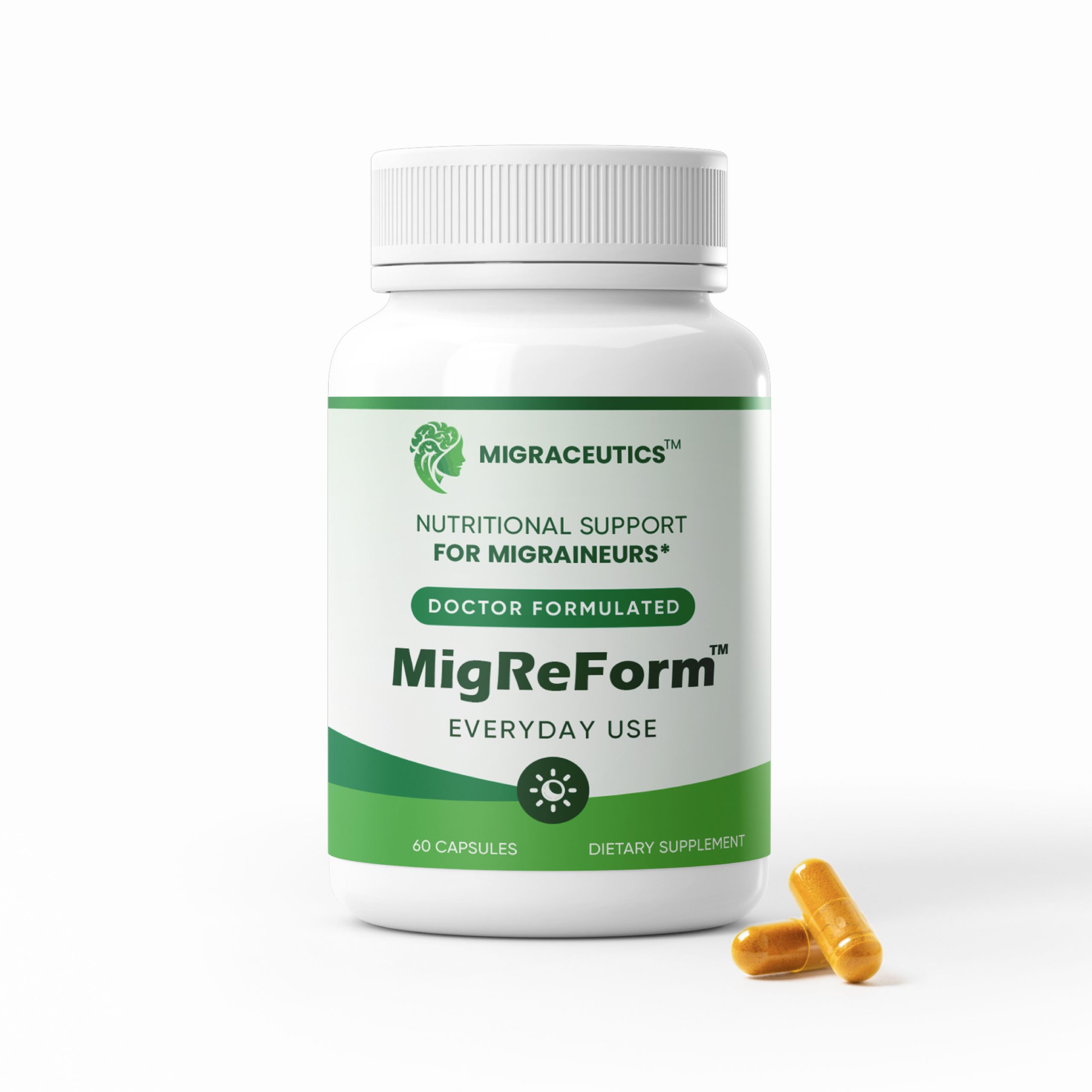 MigReForm™ is a multivitamin combining Vitamin C, B2, B3, B6, B9, and B12, magnesium, zinc, and CoQ10. It is intended to provide day-to-day protective support throughout the symptom-free and the symptomatic migraine phases.