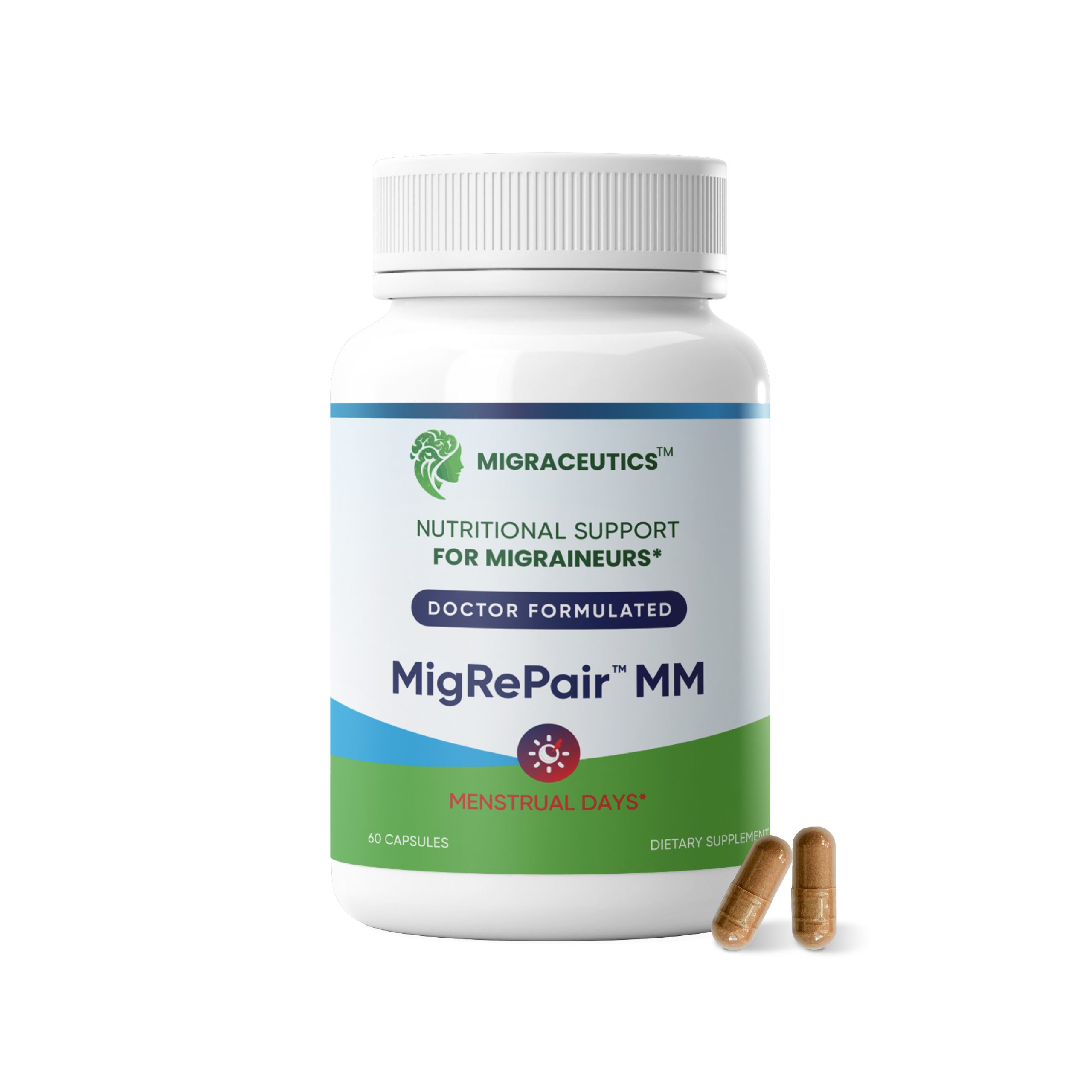 Both MigRePair and MigRePair MM are formulated to help with migraine symptoms relief. MigRePair MM is formulated specifically to assist around the days of the menstrual period, when migraine predictably strikes due to hormone fluctuations and inflammation due to prostaglandins.