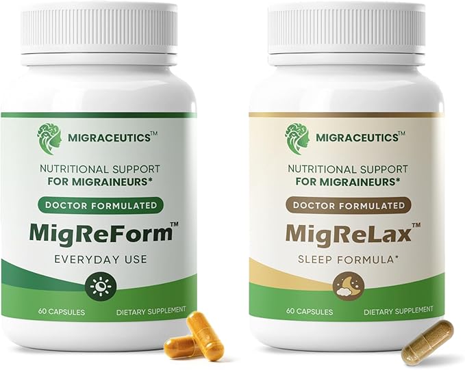 Doctor formulated, USPTO patent pending migraine supplements bundle for daily use & also for migraine discomfort days & for relaxation and tension relief. Bundle includes MigReForm containing magnesium, vitamin B2 (riboflavin), CoQ10 & MigReLax containing valerian, lemon balm, passion flower, and hops. Most users report results in 1–3 months.