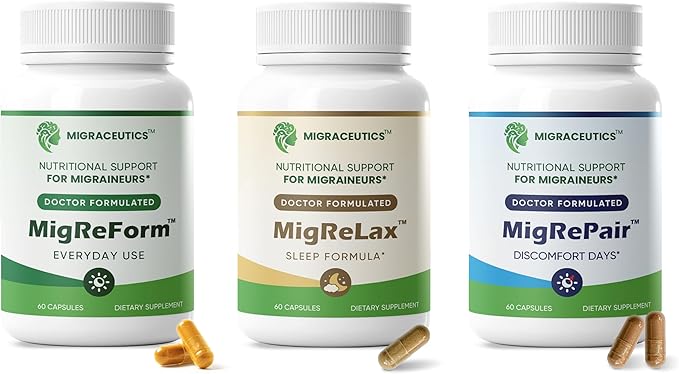 MigReForm: Everyday use for women and men throughout both the ictal and interictal migraine phases. Take two (2) capsules daily, preferably one in the morning and one in the evening, as a dietary supplement or as recommended by your healthcare professional. MigRePair: Everyday use for women and men during the ictal/migraine discomfort phase. Take two (2) capsules daily, preferably in the evening, as a dietary supplement or as recommended by your healthcare professional. MigReLax: Everyday use for women and men during the ictal/migraine discomfort phase, or as needed. Take one (1) capsule daily or as needed, preferably in the evening, as a dietary supplement or as recommended by your healthcare professional.