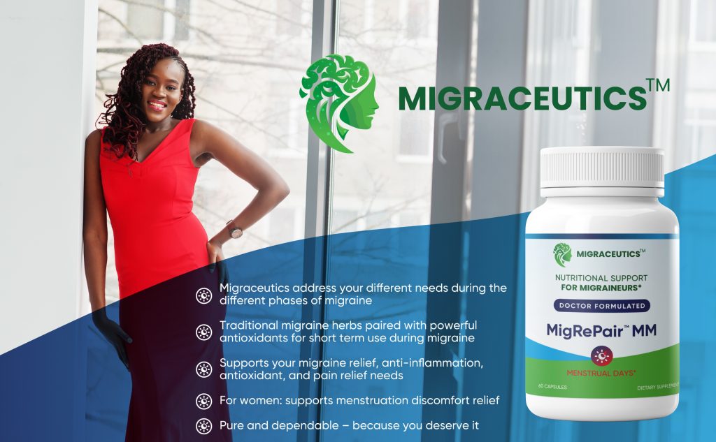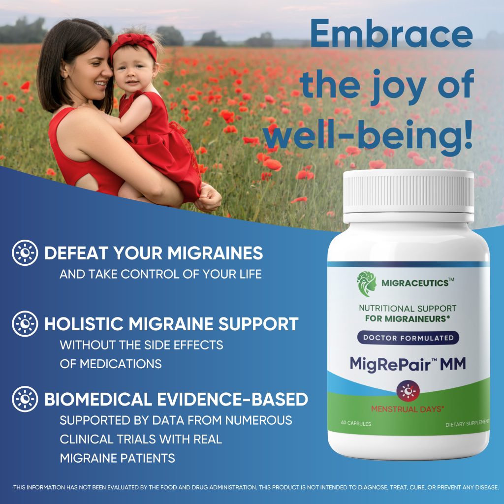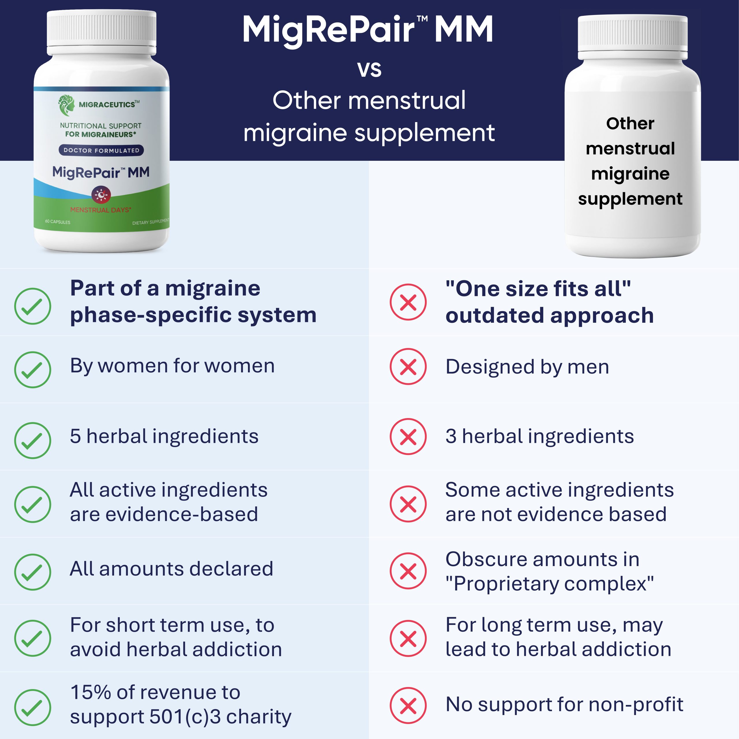 Migraceutics is a patent pending, holistic, natural product line formulated by a doctor based on decades of biomedical research and clinical trials with real migraine patients. Migraceutics provide migraine phase-specific and threshold strengthening targeted support. Our formulas acknowledge the phases of migraine: the ictal/migraine phase (premonitory, headache, postdrome, and aura stages), and the interictal phase; and that migraine is a sensitivity threshold disease. Migraceutics are designed to assist neural pathways in the body, and the “central sensitization” loop, and to support migraineurs’ impaired sensory thresholds (light, sounds, touch, smell, pain). Migraceutics – MigReForm: High-bioavailability proprietary magnesium blend, vitamin B2 riboflavin, non-flush Vitamin B3 niacinamide, Vitamin B6 pyridoxal 5 phosphate, Vitamin B9 folate, Vitamin B12 cyanocobalamin, Vitamin C, high-bioavailability CoQ10, and high-bioavailability Zinc citrate. See supplement facts on the label for detailed information. Our proprietary magnesium glycerophosphate and magnesium oxide blend has up to 50 times the bioavailability of magnesium oxide alone and is also superior to magnesium citrate. Our Vitamin B6 blend results in 2.5 times higher serum levels than Vitamin B6 alone. HydroQSorb® is a patented CoQ10 component with 18 times the bioavailability compared to standard CoQ10. Zinc citrate has the highest bioavailability of many tested zinc supplements. We provide you with the non-flush form of Vitamin B3 (niacinamide) for a combination of best results and most comfort. Clinical studies show that long-term continued use of butterbur and feverfew may harm your health. Migraceutics – MigReForm does not contain any butterbur or feverfew. Based on research, we specifically created a sister product: Migraceutics – MigRePair provides you with certified PA-free butterbur and feverfew along with Pinus pinaster (pine bark) and grapeseed extract for powerful short-term support during the premonitory, headache, and postdrome stages of the migraine phase. Migraceutics – MigRePair MM was specifically designed by women for women. This unique formula combines feverfew with Pinus pinaster (pine bark), grape seed extract, ginger extract, and white willow bark extract to provide powerful herbal support during the sensitive days surrounding your menstrual cycle – from Day 21 of your current cycle through Day 5 of your next cycle.
