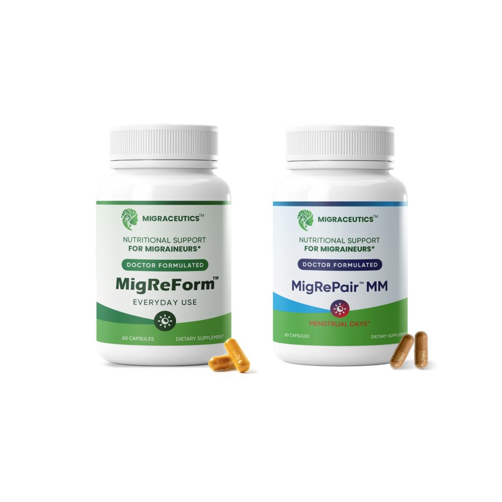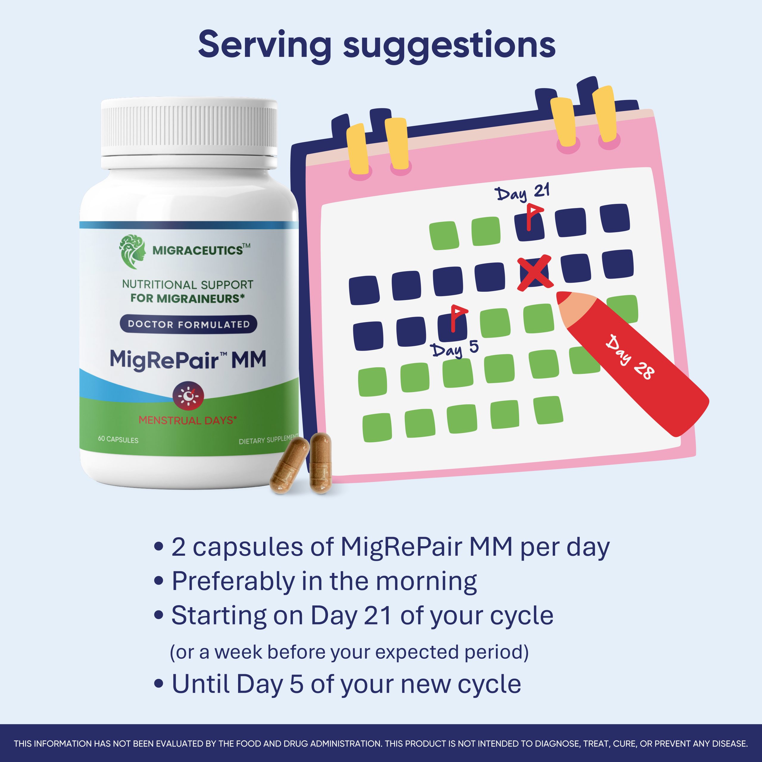 MigReForm: Everyday use for women and men throughout both the ictal and interictal migraine phases. Take two (2) capsules daily, preferably one in the morning and one in the evening, as a dietary supplement or as recommended by your healthcare professional. MigRePair MM: Designed by women for women to support migraine health related to menstrual migraine and menstrual inflammation. Take two (2) capsules daily, preferably in the morning with a meal, starting on Day 21 of your current cycle until Day 5 of your new cycle, as a dietary supplement or as recommended by your healthcare professional.