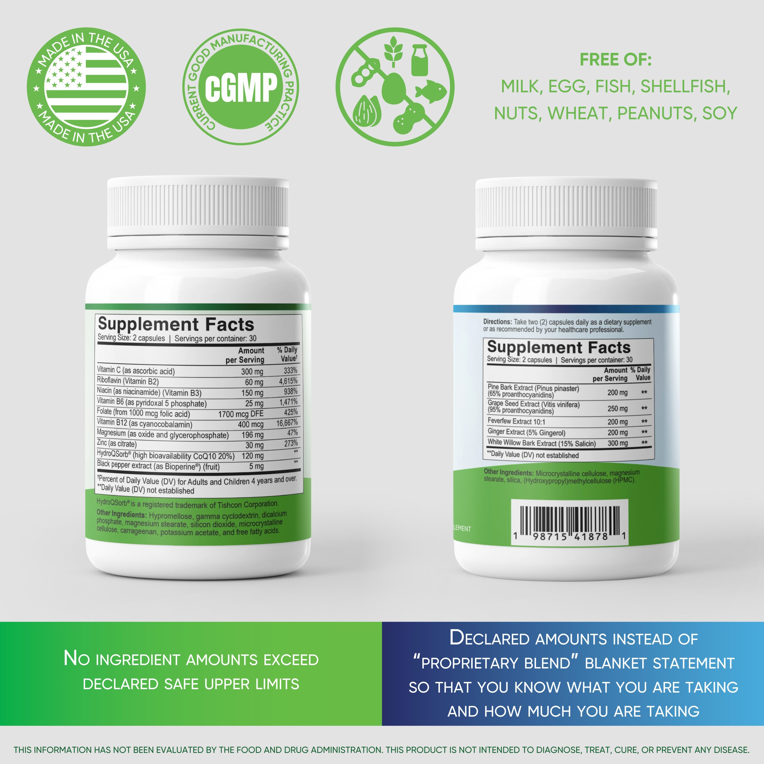 Feverfew, White Willow Bark, Ginger, Pine Bark, Grape Seed Extract