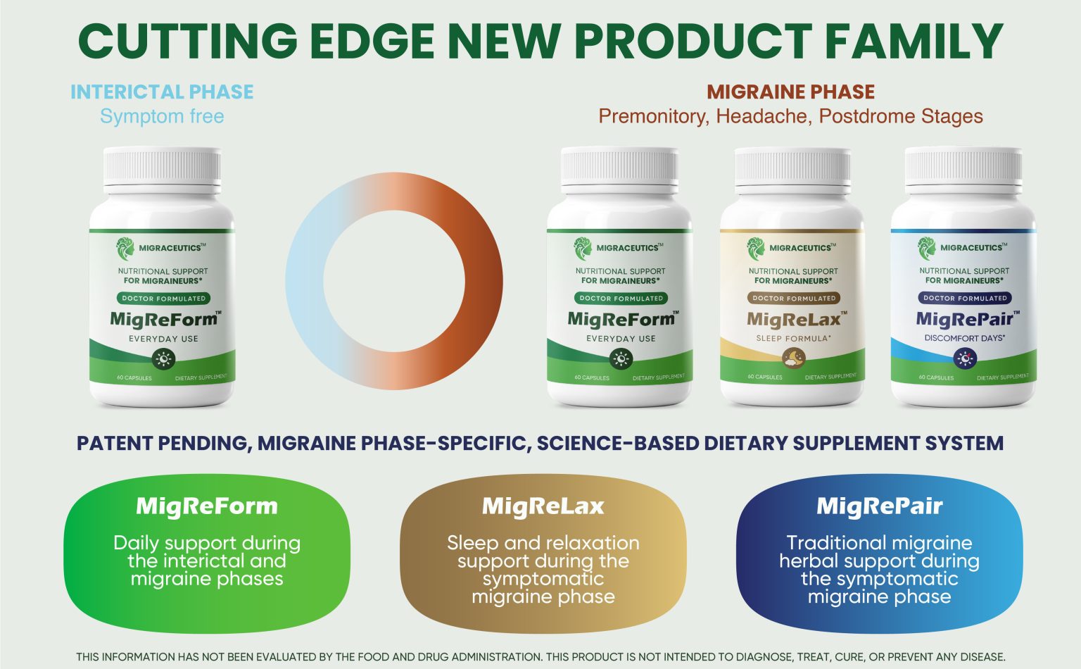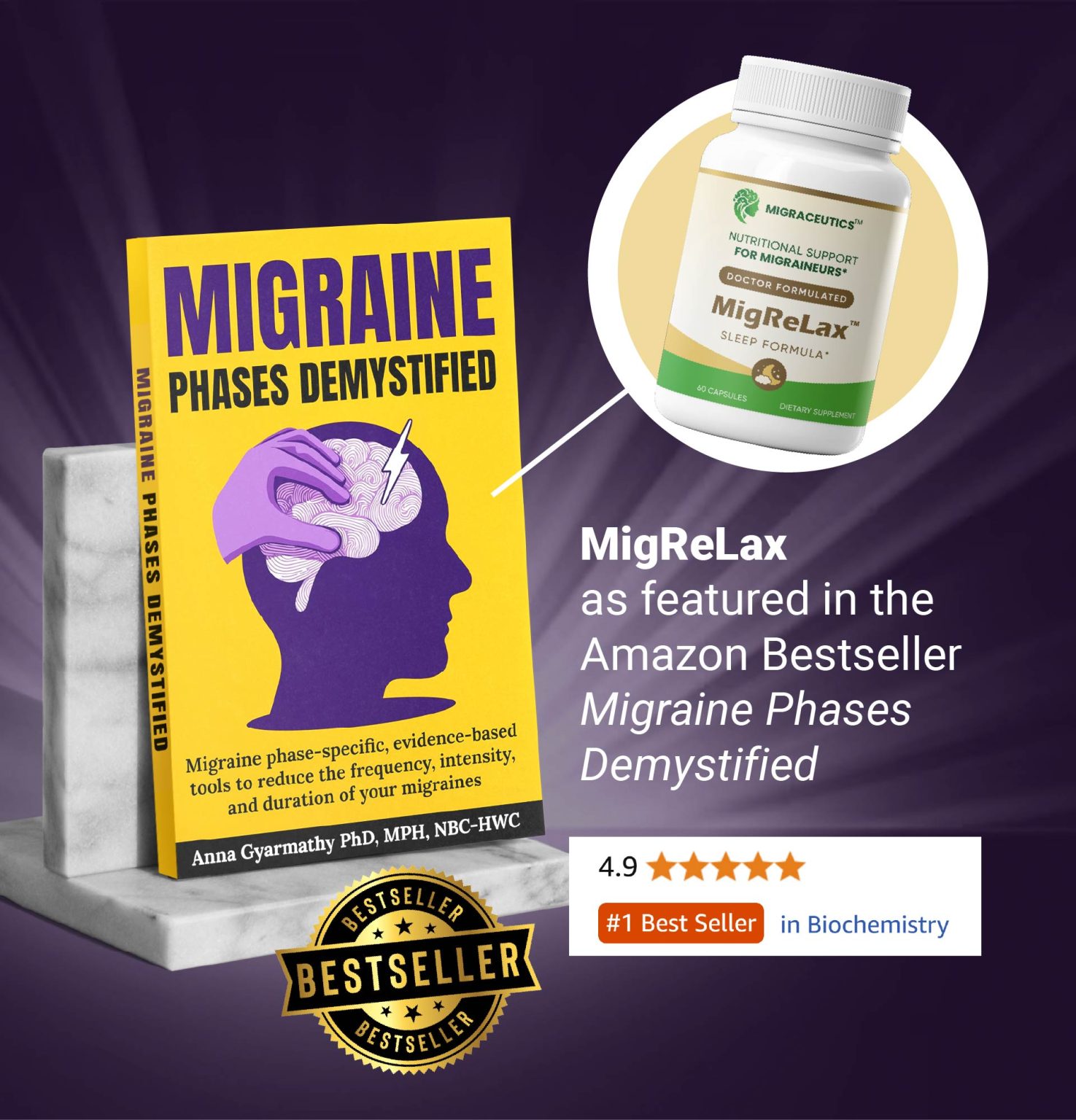 Migraceutics is a patent pending, holistic, natural product line formulated by a doctor based on decades of biomedical research and clinical trials with real migraine patients. Migraceutics provide migraine phase-specific and threshold strengthening targeted support. Our formulas acknowledge the phases of migraine: the ictal/migraine phase (premonitory, headache, postdrome, and aura stages), and the interictal phase; and that migraine is a sensitivity threshold disease. Migraceutics are designed to assist neural pathways in the body, and to support migraineurs’ impaired sensory thresholds (light, sounds, touch, smell, pain). Lack of sleep can be a trigger of migraine, which is improved with restful sleep. We specifically created Migraceutics – MigReLax with valerian, lemon balm, passion flower, and hops for migraine suffering women and men to support restful sleep and therefore provide migraine support especially during the premonitory and headache phases.